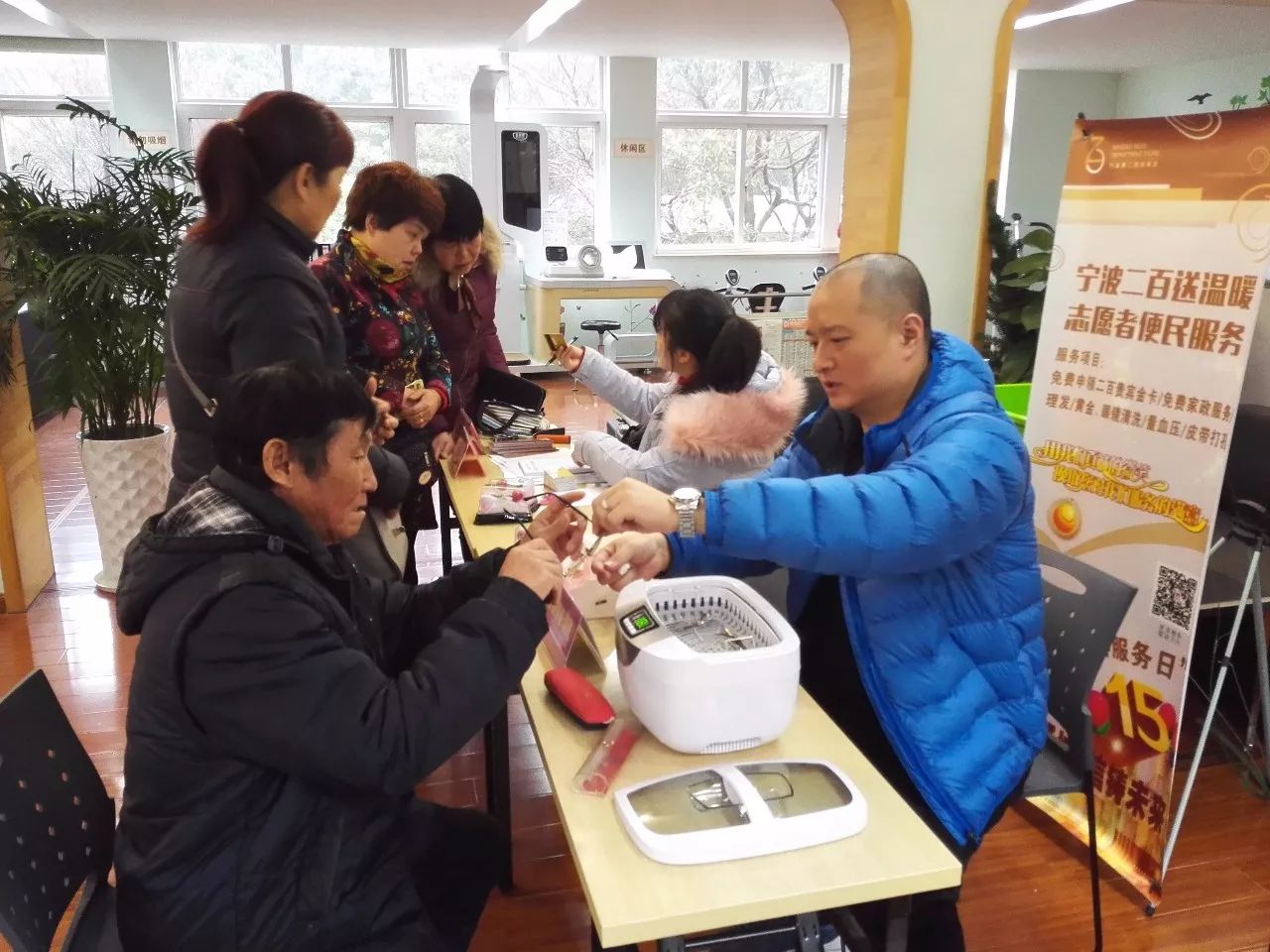 12月28日,一個陰雨綿綿的日子,冷空氣的到來,使甬城染上了絲絲涼意。這樣的日子里,寧波二百志愿者團隊一大早便驅車趕往位于鐘公廟街道的鐘盈小區(qū)進行便民服務。盡管天氣欠佳,但志愿者的熱情確絲毫未曾懈怠,到了小區(qū)服務點之后??粗蝗喝呵皝淼睦夏昃用?,二百志愿者們開啟了忙碌的“行程”。此次二百提供的便民項目主要有:黃金眼鏡清洗、皮帶打孔、血壓測量、義務理發(fā)以及貴賓卡免費申領。